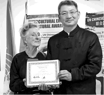 Doreen Hynd is awarded a special honor by Cao Guozhong, president of the UN Staff Recreation Council tai chi club on April 20. [Photo provided to China Daily]